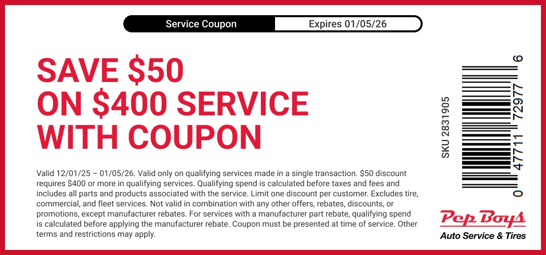 Valid 12/01/25 - 01/05/26. Valid only on qualifying services made in a single transaction. $50 discount requires $500 qualifying services. Qualifying spend calculated before taxes and fees and includes all parts/products associated with the service. Limit 1 discount per customer. Excludes tire, commercial, and fleet services. Not valid in combination with any other offers, rebates, discounts, or promotions, except mfg rebates. For services with a manufacturer part rebate, qualifying spend is calculated before applying the manufacturer rebate. Coupon must be presented at time of service.Other terms and restrictions may apply. See Coupons for Oil Changes, Tires, Brakes & More for coupon.